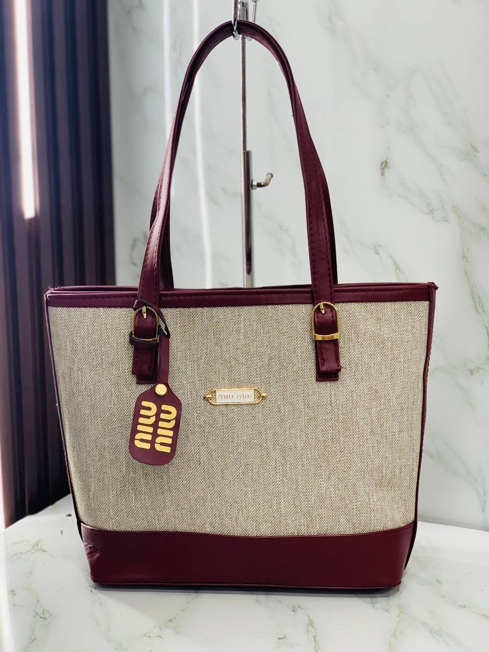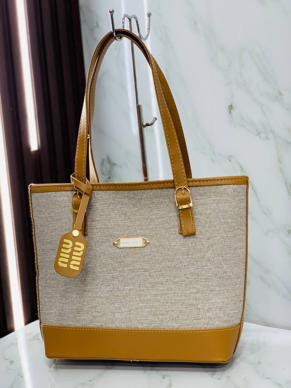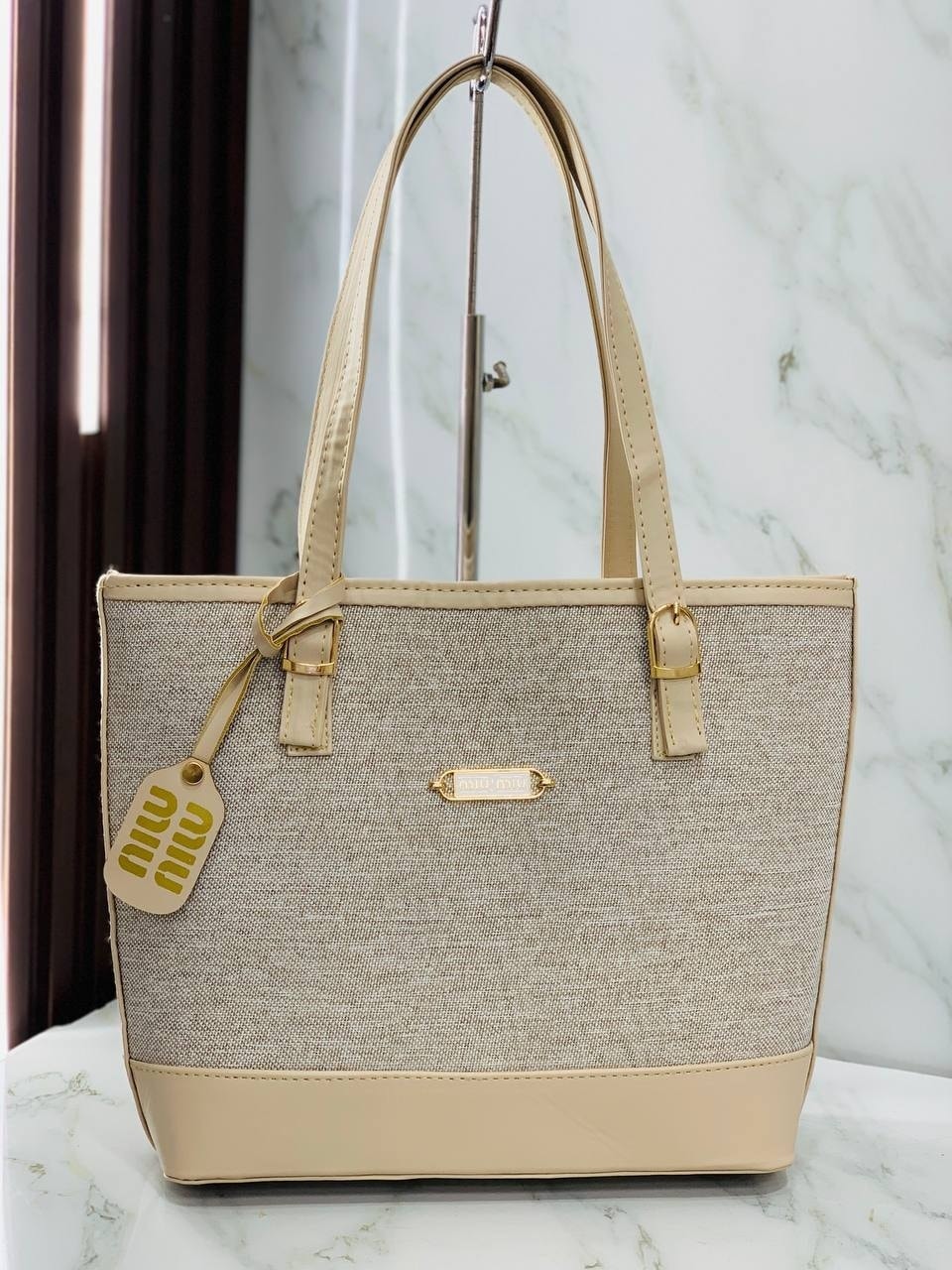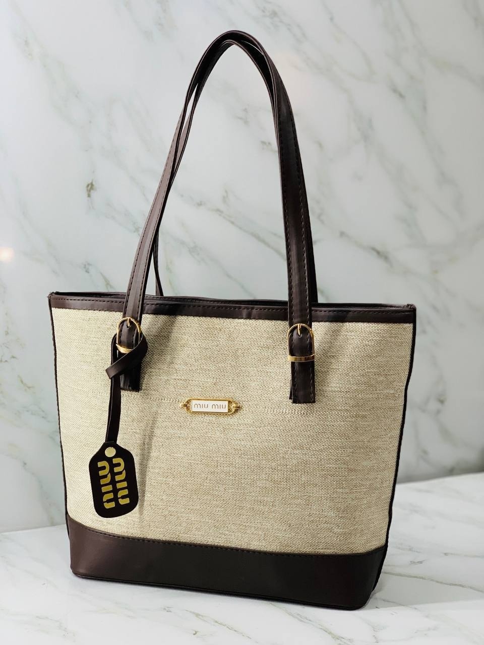 Two-Tone Canvas Tote combines classic elegance with a modern edge. Featuring a durable beige woven body and rich leather-look trim, it is finished with polished gold-tone hardware and a signature hangtag.